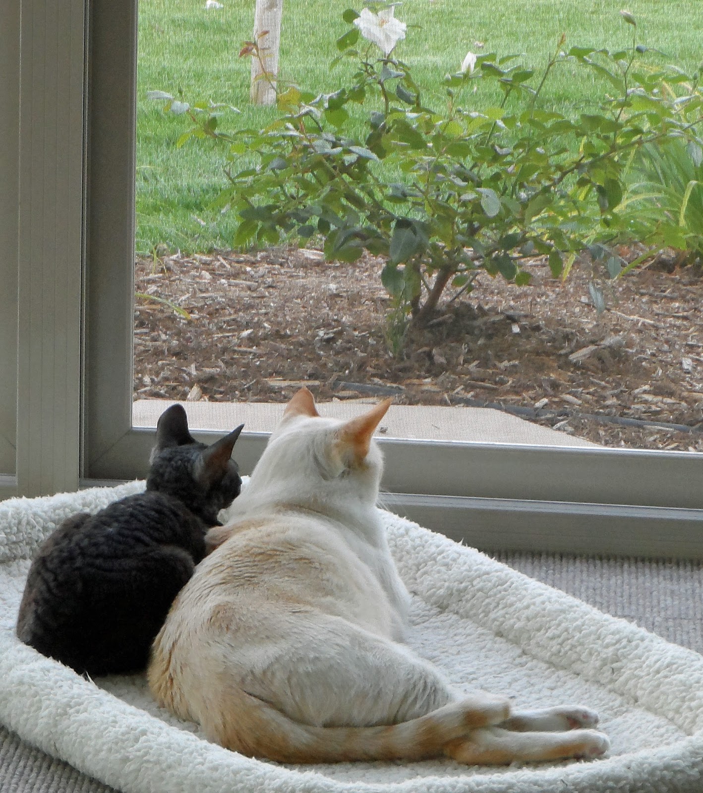 In the blink of an eye, the terrible hot summer died and a glorious autumn was our reward! The nights turned cool and then downright cold, with the days sunny and just-right-warm. I made two trips to see the Rocky Mountain foliage display, even though my own back yard was putting on a small personal show for me. Here are some shots of early September in my Timnath house. Note the new patio room and Timmy and Aidan guarding the house against the finches.
